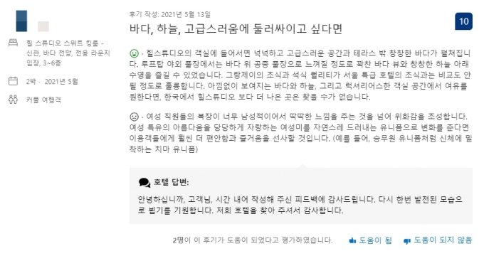 그러나 이용객은 호텔의 단점에 관한 평가를 두고 "여성 직원들의 복장이 너무 남성적이어서 딱딱한 느낌을 주는 것을 넘어 위화감을 조성한다"고 언급했다. 이 이용객은 "여성미를 자연스레 드러내는 유니폼으로 변화를 준다면 이용객들에게 편안함과 즐거움을 선사할 것"이라며 "승무원 유니폼처럼 신체에 밀착하는 치마 유니폼" 등의 내용을 덧붙였다.