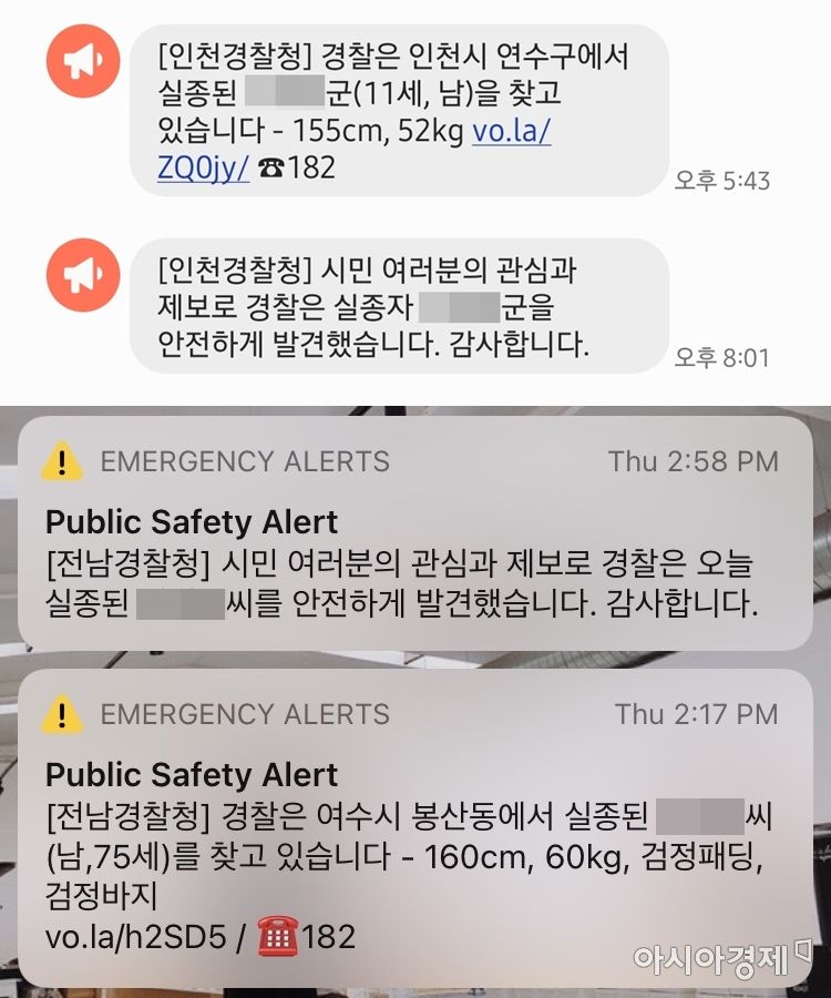 [아시아경제 송승윤 기자] '실종경보 문자 제도'가 시민들의 호평을 받고 있다. 문자를 받은 시민의 제보가 실종자 발견으로 이어지는 사례도 속속 나오고 있다.
