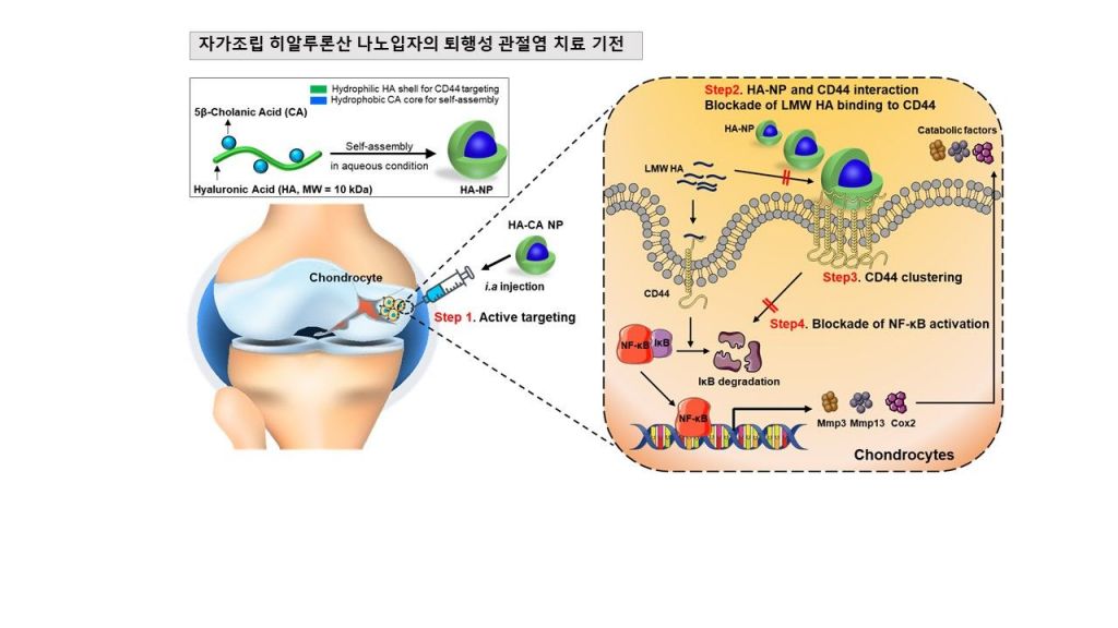 연구팀은 선형 히알루론산과 달리 압축된 구형의 자가조립 히알루론산 나노입자가 안정성이 더 높아 생체 내에서 오래 지속되며 염증완화 효과도 높일 수 있을 것이라 가정했다. 실제 연구팀이 생쥐 무릎에 자가조립 히알루론산 나노입자를 주입한 결고 연골을 투과해 연골세포 막에 존재하는 CD44 수용체에 결합해 연골 파괴를 막는 것을 다광자 및 공초점 현미경으로 확인했다. 나노입자에 다수의 CD44 결합부위가 있어 동시에 여러 CD44와 결합 , 세포막에 CD44 뭉침현상(clustering)을 일으켜 CD44 활성을 효과적으로 억제한다는 것이다. 즉 약물을 담지하지 않은 약물 전달체인 자가조립 히알루론산 나노 입자 자체가 연골파괴를 매개하는 이화인자를 돕는 CD44 수용체(퇴행성 관절염 환자에서 높은 농도로 발현되는 세포막 수용체) 발생을 줄였다.