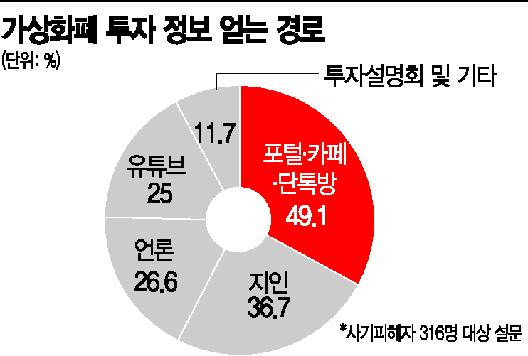 본지가 불량코인 사기피해자 316명을 대상으로 지난 1~15일 진행한 설문에 따르면 사기피해자 중 49.1%인 158명이 코인 관련 투자 정보 경로를 묻는 질문에 ‘포털·카페·단톡방’을 통해서 접한다고 답했고 유튜브는 25%(79명)인 것으로 집계됐다. 본지 설문에 응답한 사기피해자 A씨는 “각 단계마다 지인을 어떻게 끌어들여 코인에 돈을 태우게 하는지를 상세히 설명하는 유튜브 영상이 아직도 있다”며 “이런 영상을 믿는 분들이 코인 단톡방에 현재도 존재한다”고 했다.