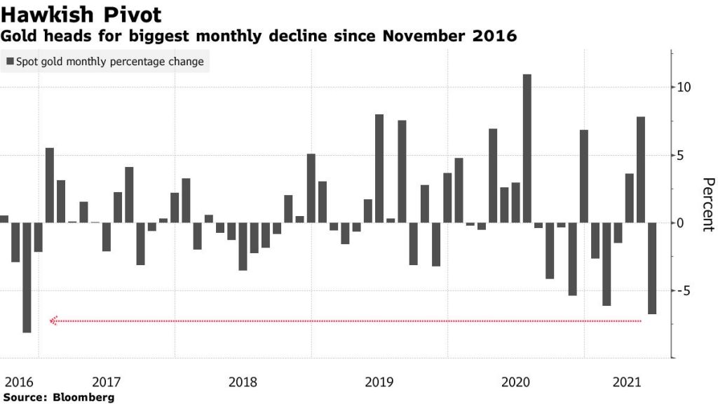 [아시아경제 박병희 기자] 금 가격이 이번달에 7% 가까이 하락해 월간 기준 2016년 11월 이후 최악의 수익률을 기록할 것으로 예상된다고 블룸버그 통신이 29일(현지시간) 보도했다.