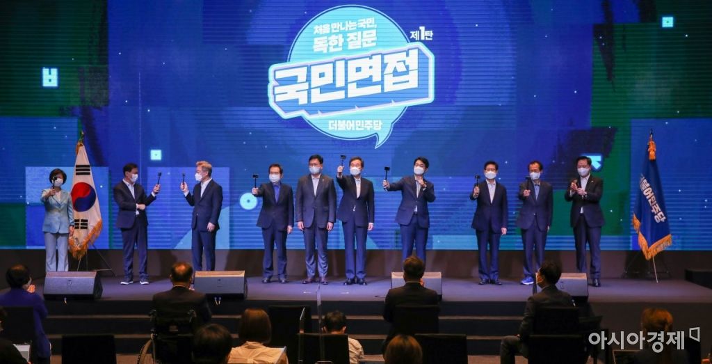더불어민주당 대선 예비후보 등록을 마친 9명의 후보가 1일 서울 여의도 글래드호텔에서 열린 공명선거·성평등 실천 서약식 및 국민면접 프레스데이에 참석, 송영길 대표에게 액션캠을 들고 포즈를 취하고 있다./윤동주 기자 doso7@