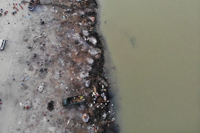 인도 갠지스강 화장장을 공중에서 내려본 사진. 강가에 장작으로 시신을 태운 흔적이 여기저기 남아 있다. [이미지출처=연합뉴스]