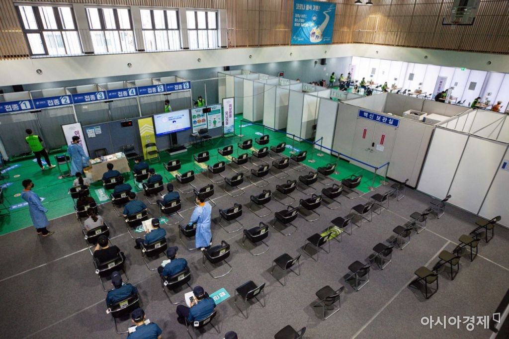 코로나19 예방 백신 1차 접종 목표치인 1300만명을 넘어서며 당초 예상일 보다 조기 달성한 16일 서울 서대문구 코로나19백신접종센터에서 경찰병력이 백신 접종에 나서고 있다./강진형 기자aymsdream@