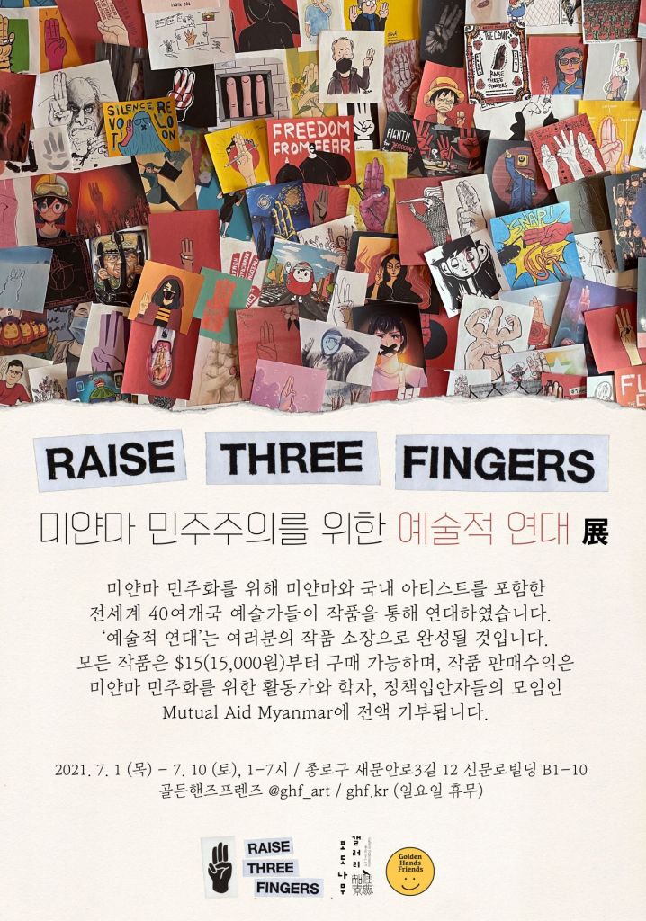 골든핸즈프렌즈 아트(GHF Art)는 이달 1일부터 10일까지 서울 종로구 새문안로 3길 12 신문로 빌딩 B1-1에서 'Raise Three Fingers! 미얀마 민주주의를 위한 예술적 연대' 전시회를 개최한다.