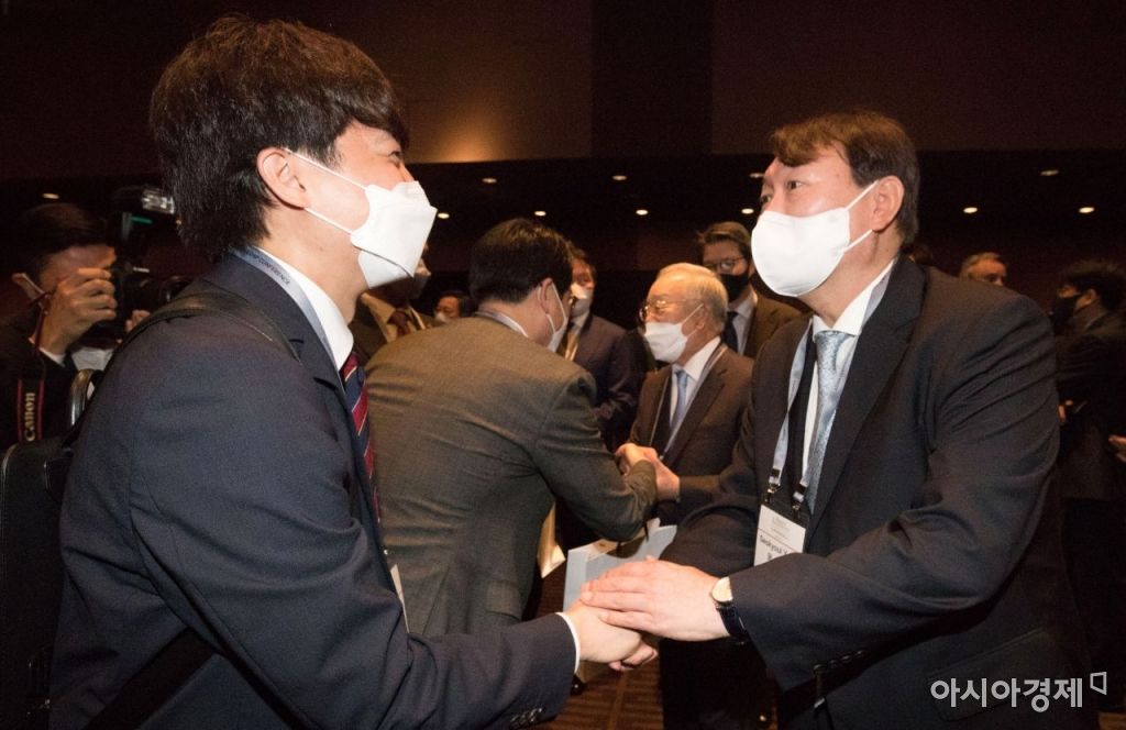 이준석 국민의힘 대표와 윤석열 전 검찰총장이 30일 서울 중구 신라호텔에서 열린 한 행사에 참석, 인사를 나누고 있다./국회사진기자단