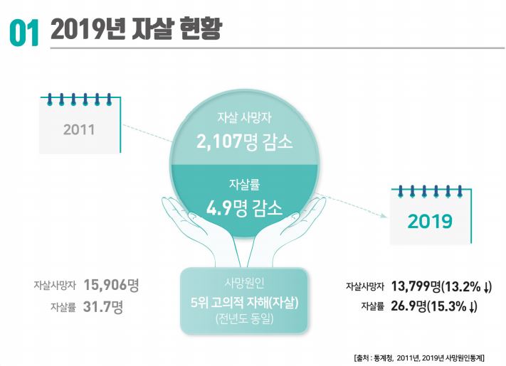백서에 따르면 2019년 우리나라의 자살자 수는 1만3799명으로 전년 대비 129명(0.9%) 증가했다. 자살률은 인구 10만명당 26.9명으로 0.2명 늘었다. 이는 자살률이 최고치였던 2011년(자살자 수 1만5906명, 자살률 31.7명)과 비교할 때 자살자 수는 2107명(13.2%) 감소하고, 자살률은 4.9명(15.3%) 줄어든 수치다.