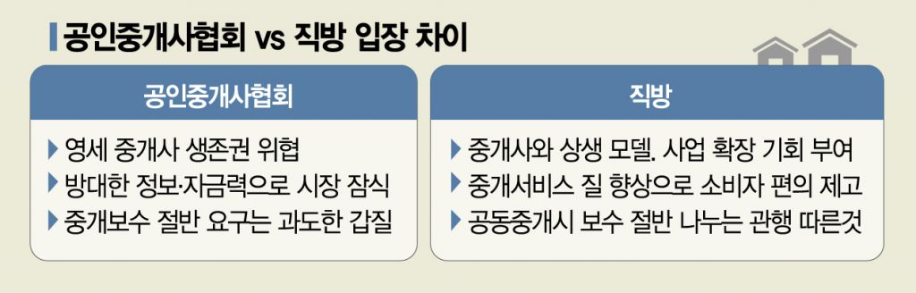 중개사들은 직방이 직접 중개에 뛰어드는 것이 아니라면서 중개보수는 절반으로 나누겠다는 발상은 어불성설이라는 입장이다. 한 중개사는 "직방의 정보제공자는 전국의 개업공인중개사들이고, 이들이 새로운 매물을 계속 업데이트해야만 직방도 사업을 할 수 있는 것"이라며 "갈수록 높아지는 광고료도 부담인데 중개보수 50%는 과도하다"고 말했다. 다른 중개사는 "배달 어플리케이션이 수수료를 인상하겠다고 했을 때 전국 자영업자들이 난리가 났는데 직방은 수익의 절반을 가져가겠다는 논리"라고 강조했다.