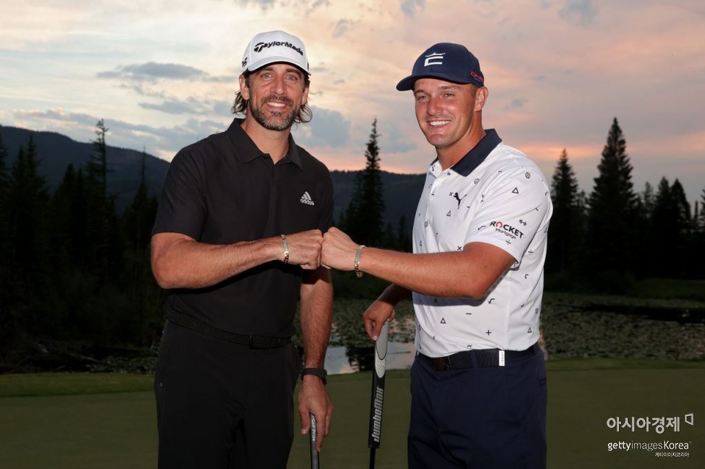 브라이슨 디섐보(오른쪽)와 NFL 스타 에런 로저스가 2대2 이벤트 대회 ‘더매치’에서 우승한 뒤 기뻐하고 있다. 빅스카이(미국)=Getty images/멀티비츠