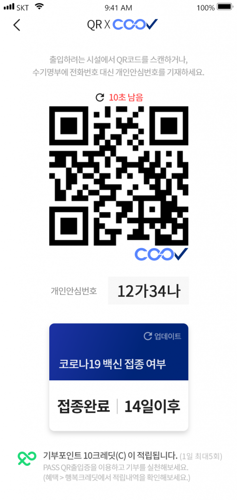 현재는 이용자가 'PASS QR 출입증' 이용 시 1일 1회 10크레딧(c)을 적립할 수 있는데, 프로모션 기간 동안에는 1일 5회까지 적립 한도를 상향해 일 최대 50크레딧이 적립 가능하다. 행복크레딧의 1크레딧은 1원의 가치를 지니며, 적립된 내역은 'PASS' 앱 내 혜택 행복크레딧에서 확인 가능하다.