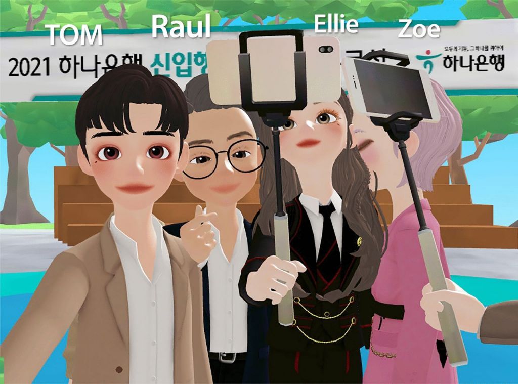 전날 열린 행사는 박성호 하나은행장이 제페토 내 아바타 캐릭터 '라울'로 참석한 가운데 ▲하나글로벌캠퍼스 투어 ▲그랜드 오프닝 기념사진 ▲신입행원 벗바리 활동 수료식 순서로 진행됐다. 행사가 진행되는 동안 신입행원들은 라울에게 자신들이 직접 설계하고 만든 공간을 안내하며 기념사진은 물론 함께 '셀카'를 촬영하기도 했다.