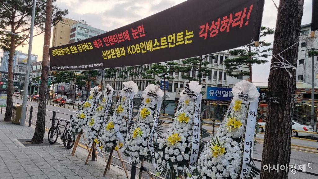 서울 중구 을지로 대우건설 본사 앞에 대우건설 노조가 설치한 화환과 플래카드가 내걸려있다.