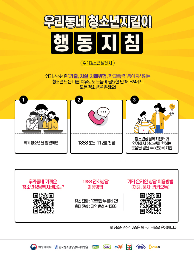 여가부는 편의점에 자체 개발·보급한 위기 청소년 발견 직원 행동지침을 비치하고, 4만4000여개 편의점을 통해 위기청소년 보호·지원 정부 정책도 홍보하기로 했다. 한국청소년상담복지개발원을 통해 편의점 종사자 대상 청소년인권교육 등 온라인 교육을 제공할 계획이다.