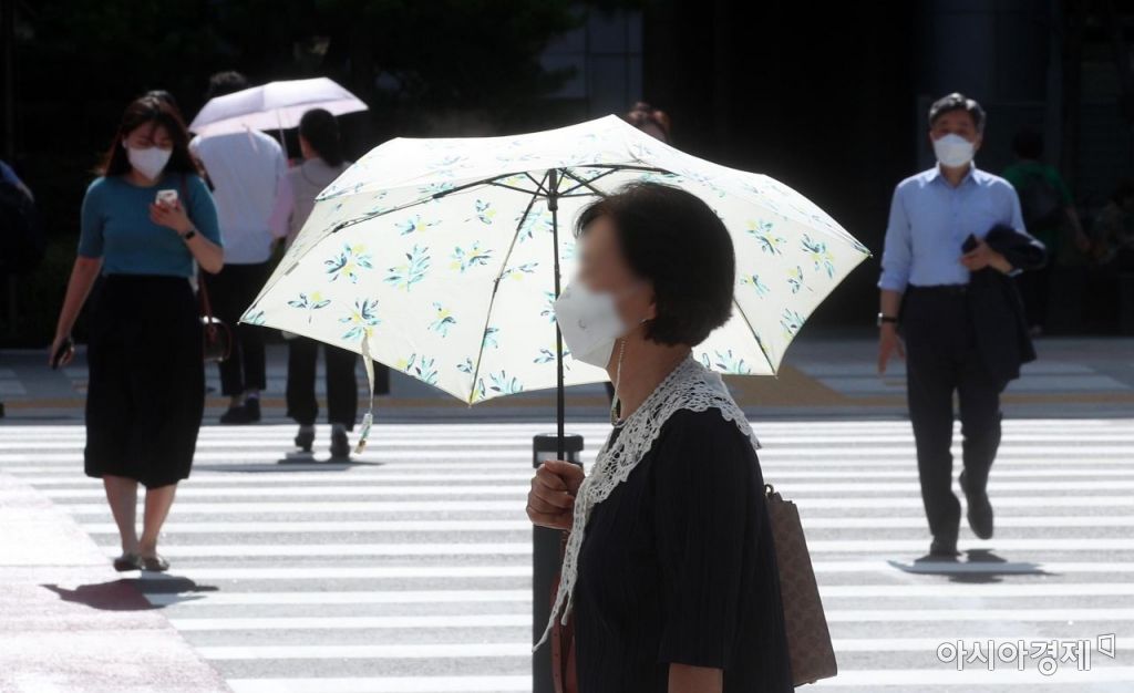 전국 대부분 지역에 폭염 특보가 내려진 15일 서울 세종대로 인근에서 출근길 시민이 양산을 쓴 채 발걸음을 재촉하고 있다. /김현민 기자 kimhyun81@