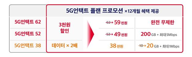 이 기간 5G언택트 62 요금제에 가입하는 고객은 5만원대 요금으로 5G 데이터를 무제한으로 이용할 수 있다. 이는 데이터 완전 무제한을 제공하는 일반 요금제(5GX 프라임, 월 8만9000원)보다 33% 이상 저렴한 금액이다.