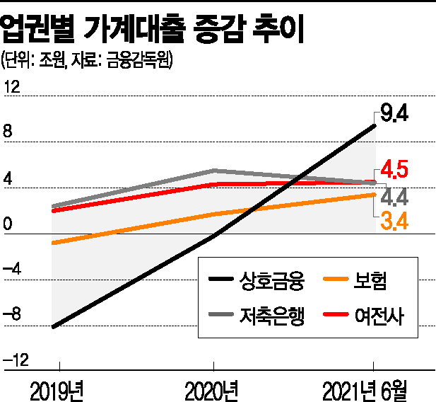 16일 금융감독원 및 감독당국에 따르면 상호금융의 올해 상반기 가계대출은 9조4000억원 순증했다. 2019년과 2020년 각각 8조1000억원과 2000원 감소한 것과는 상반된 수치다. 비교적 가계대출 비중이 낮은 보험사 큰 폭의 증가세를 보였다. 2019년 8000억원 감소에서 지난해 1조7000억원, 2021년 3조4000억원까지 불어났다.