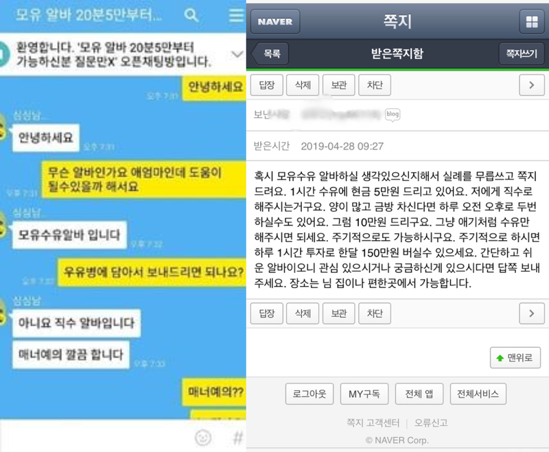 맘카페나 블로그에는 2019년부터 ‘모유수유 알바제의 조심하세요’ ‘모유알바 제의 쪽지를 받았다’ 등의 글이 올라오고 있었다.