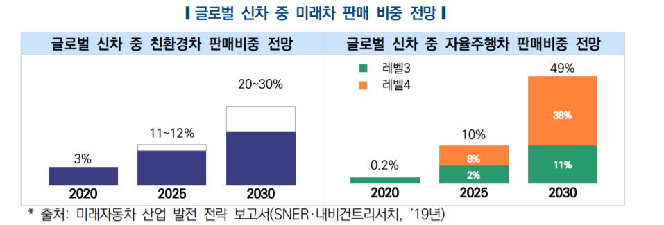 연구원은 글로벌 친환경차 시장은 2030년까지 신차판매의 20~30%(약 5770만대) 규모로 성장할 것으로 예측했다. 또한 레벨 3 이상 자율주행차 시장은 2030년까지 신차판매의 49%를 차지할 것으로 전망했다.
