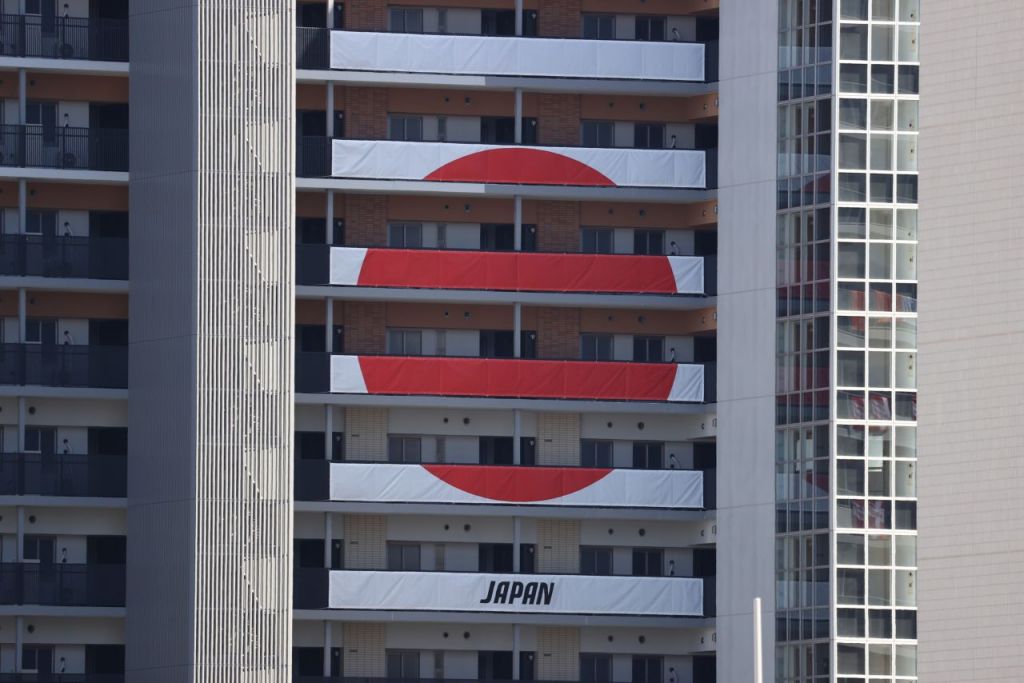 18일 도쿄올림픽 선수촌 일본팀 숙소 앞에 걸린 일장기의 모습. 도쿄(일본)=로이터·연합뉴스
