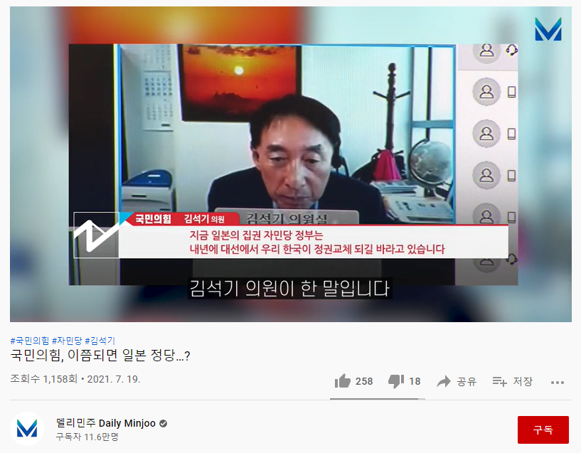 19일 더불어민주당 유튜브 채널 '델리민주'에 올라온 '국민의힘, 이쯤 되면 일본 정당...?'이라는 제목의 영상. 김석기 국민의힘 의원이 '일본은 한국의 정권교체를 원한다'는 취지로 한 발언을 비판하는 내용을 담았다./사진=유튜브 채널 '델리민주' 영상 캡처