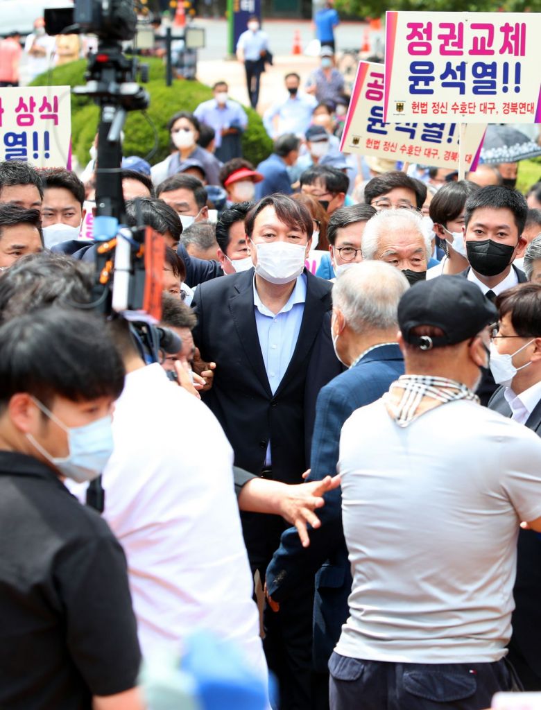 한편 이날 윤 전 총장은 정치 선언 후 처음으로 대구를 방문해 보수 표심 다지기에 나섰다. 그는 이날 대구 달서구 2.28민주의거기념탑에서 참배한 뒤 이승만 정권의 독재에 항거한 주역과 만남을 갖고, 서문시장에 들러 상인들과 만났다.