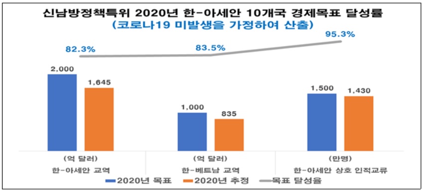 전경련은 지난해 코로나19가 발생하지 않았다고 가정해 베트남, 인도네시아를 비롯한 아세안 10개국과 인도와의 교역·인적교류를 추정한 결과 지난해 아세안 10개국과의 교역규모는 1645억달러가 됐을 것으로 평가했다. 2010~2019년 연평균 증가율을 대입해 지난해 수치를 산출해낸 값이다. 정책 목표 달성률은 82.3%다.