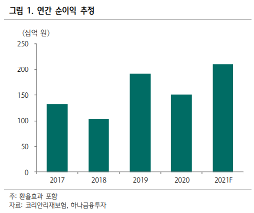 이홍재 하나금융투자 연구원은 "코리안리의 2분기 순이익은 전년 대비 -17.5% 감소하고, 전분기 대비 6.7% 늘어난 603억원을 기록할 전망"이라고 밝혔다. 쿠팡 물류창고 화재(약 65억원)와 해외 코로나19 관련 사망 보험 손실(약 200억원) 반영에도 재보험료 인상과 특약 조정 효과 등이 영향을 줬다는 설명이다.