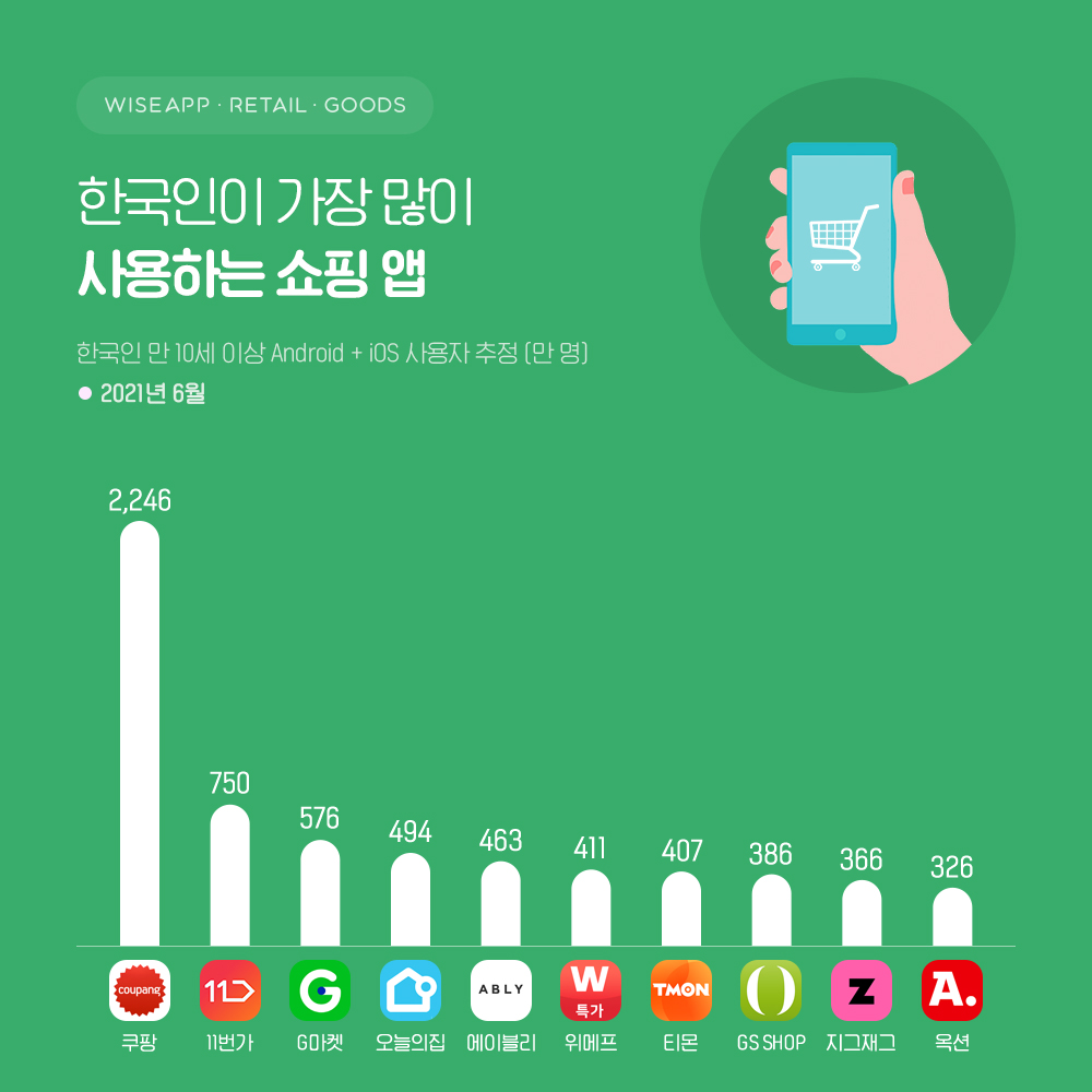와이즈앱이 한국인 만 10세 이상 스마트폰 사용자(Android + iOS)를 표본 조사한 결과 쿠팡은 지난 6월 한 달 간 2246만 명이사용했다. 이어 11번가 750만 명, G마켓 576만 명, 오늘의집 494만 명, 에이블리 463만 명, 위메프 411만 명, 티몬 407만 명, GS SHOP 386만 명, 지그재그 366만 명, 옥션 326만 명 순이었다.
