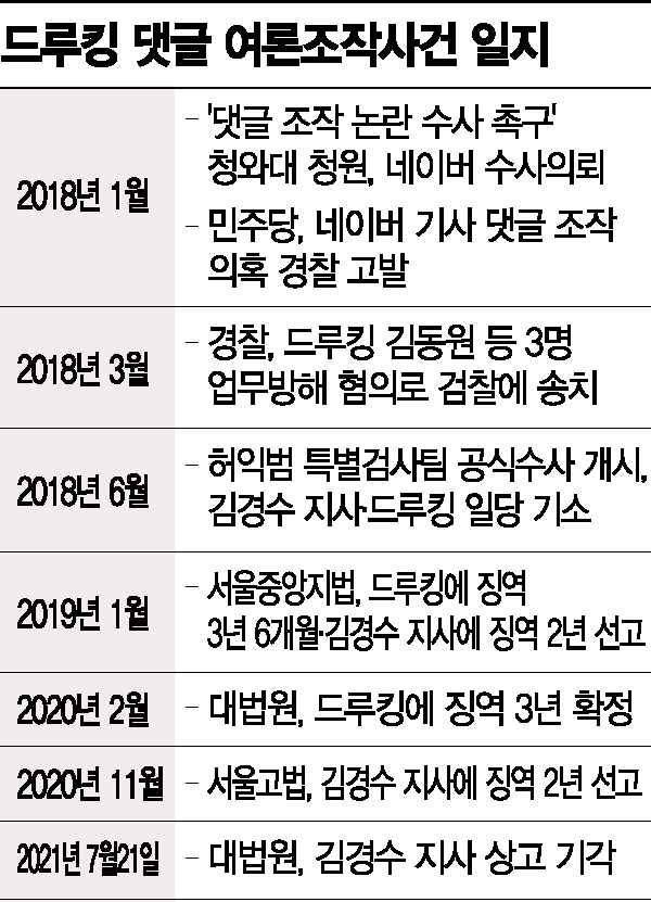 [아시아경제 조성필 기자] '드루킹 댓글 여론조작 사건'은 2017년 19대 대선을 앞두고 '드루킹'이라는 필명을 사용한 김동원씨와 그 일당이 문재인 대통령과 더불어민주당에 유리하도록 매크로(자동 입력 반복) 프로그램인 '킹크랩'을 이용해 포털사이트에서 여론을 조작한 사건이다. 2018년 평창올림픽 직전 여자 아이스하키 남북단일팀 추진과 관련해 일부 세력이 여론으로 댓글을 조작했다는 의혹이 불거지면서 수사가 촉발됐다. 당시 민주당 대표였던 추미애 전 법무부 장관이 "네이버가 가짜 뉴스를 방치한다"고 비판하자 네이버가 경찰에 수사의뢰를 했다.
