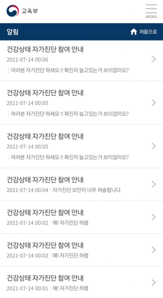 지난 14일 새벽 자가진단 앱에서 '여러분 자가진단 하세요!! 확진자 늘고있는거 보이잖아요?', '자가진단 보안이 너무 허술합니다', '자가진단 드가자' 등의 알림이 발송됐다. 이 과정에서 공격자는 5개 IP와 사용자 인증값 10개를 활용한 것으로 드러났다.
