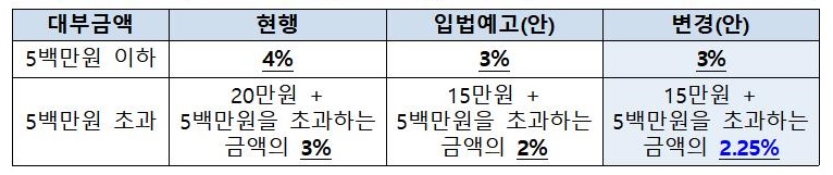 금융위는 지난 4월 높은 중개수수료에 따른 무분별한 대출 모집 행태를 개선하고 고금리 업권의 저신용자 대출 여력을 확보하기 위해 대부중개수수료 상한을 각 1%포인트 인하하는 안을 발표했다. 현행 500만원 이하는 4%, 500만원 초과는 20만원에 500만원 초과금액의 3%를 더해 지불해야 하던 것에서 500만원 이하는 3%, 500만원 초과는 15만원에 500만원을 초과하는 금액의 2%로 1%포인트 낮추는 내용이다.