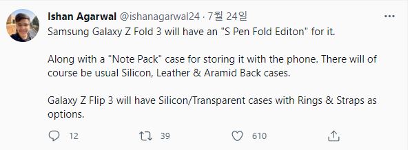 이샨 아가왈은 전날 자신의 트위터를 통해 "삼성 갤럭시 Z폴드3에는 S펜 폴드 에디션이 있다"며 "스마트폰과 함께 보관할 수 있는 노트팩도 함께 나온다"고 밝혔다. 그는 일반적인 실리콘, 가죽&아라미드 백 케이스가 나올 것이라고 덧붙였다.