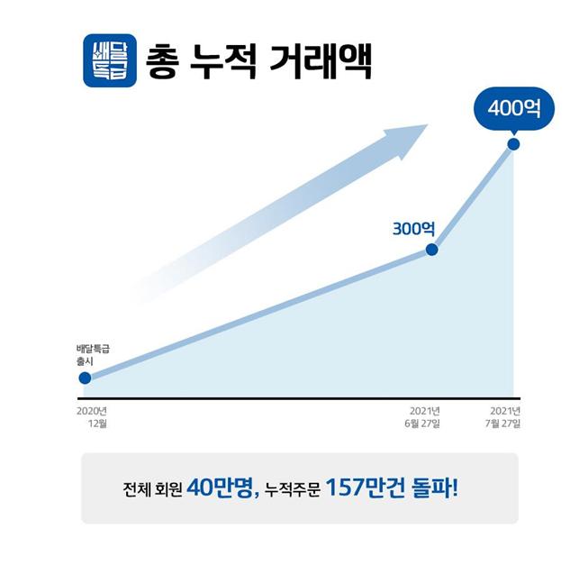 경기도주식회사는 이달 27일 기준 배달특급 누적 거래액이 400억원을 넘어섰다고 28일 밝혔다. 지난해 12월1일 출시된 배달특급은 올해 2월 100억원을 돌파했다. 이어 5월14일 200억원, 6월28일 300억원을 넘긴 데 이어 한 달 새 400억원 고지를 뛰어 넘었다.