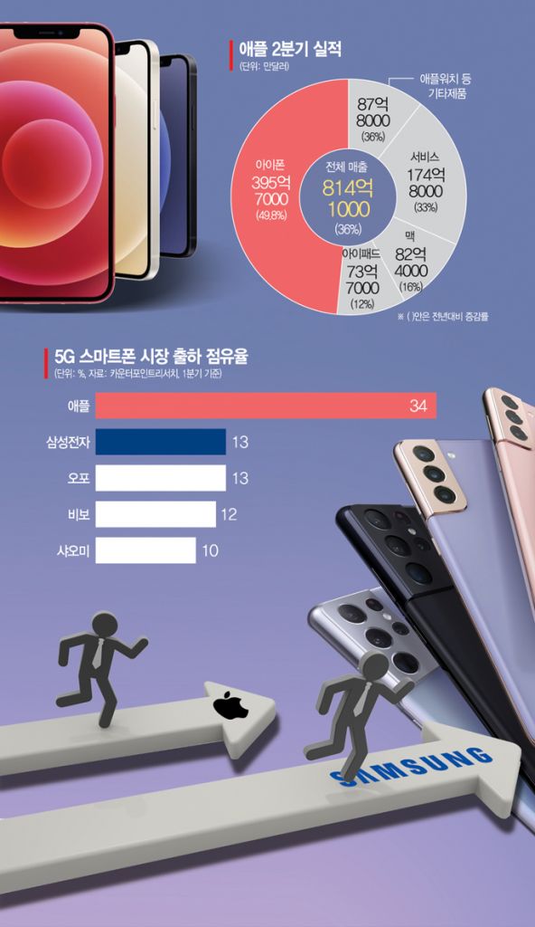 [아시아경제 조슬기나 기자, 김수환 기자]애플이 비성수기인 2분기에 사상 최대 실적을 기록했다. 첫 5G 스마트폰인 ‘아이폰12’ 효과가 지속되며 아이폰 매출은 1년 전보다 무려 50% 가까이 급증했고, 아이패드·맥(Mac)·웨어러블 모두 두 자릿수 성장을 이어갔다. 하반기 출시 예정인 ‘아이폰13’도 역대급 판매량이 기대되고 있어 세계 스마트폰시장에서 삼성전자의 오랜 왕좌까지 위협하는 모습이다. 삼성전자는 내달 ‘갤럭시 언팩’에서 신형 폴더블폰을 출시하며 돌파구를 마련한다는 전략이다.