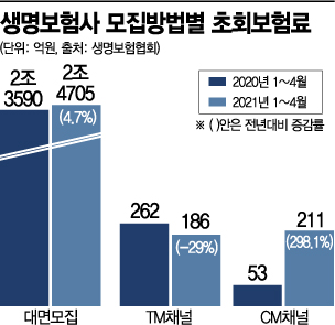 반면 생보사의 1~4월 TM채널 초회보험료는 지난해 같은 기간보다 29% 줄어든 186억원을 거두는데 그쳤다. TM채널의 경우 지난해 금융사 콜센터가 코로나19 집단 감염지로 부각된 데다, 올해 3월부터 금융소비자보호법 시행으로 전화영업의 어려움이 커지면서 점차 규모가 줄어들고 있다. 이에 따라 보험사들 역시 TM조직을 폐쇄하거나 축소하는 분위기다.