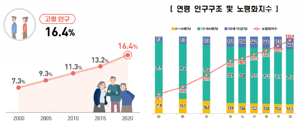 연령 별 인구구조를 살펴보면 한국 사회의 고령화가 급속도로 진행되고 있다는 점이 확인된다. 우선 2020년 기준 내국인 중위연령은 44.3세로, 1년 전(43.7세)보다 0.6세 올라갔다.