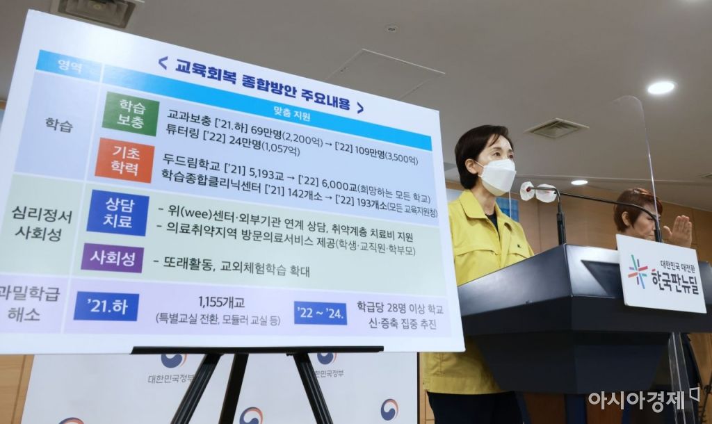 개학 이후 모든 학생을 대상으로 EBS의 AI학습진단시스템(단추)과 정서행동특성검사 등을 통해 결손을 진단하고 회복 프로그램과 연계한다. 교과보충 프로그램 외에도 교대·사범대생을 통한 소규모 학습보충과 상담을 돕는 ‘튜터링’을 실시한다. 아울러 기초학력 향상을 위한 초등학교 협력수업 운영학교도 1700개교에서 2200개교로 확대한다. 코로나19로 유아들의 언어·정서·신체발달이 저하된 상황을 고려해 전국 유치원 600개에 방과후 과정 모델도 운영한다. 직업계고 취업 지원을 위한 자격취득 응시료를 지원하고 채용 연계형 직무교육과정을 통해 취업 연계를 지원한다.