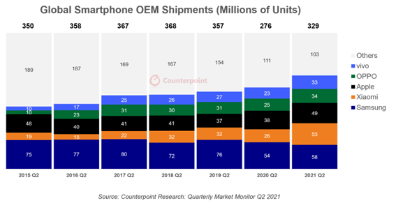 중국과 동남아시아, 유럽 등에서 최고의 실적을 기록한 샤오미는 5300만대로 2위에 올랐다. 샤오미는 코로나19로 타격을 받은 인도에서 프리미엄 전략과 저가 라인 판매를 병행하면서 글로벌 출하량을 늘렸다. 특히 동남아시아와 유럽 등 중간 가격대 시장에서의 점유율이 늘었다. 애플은 전 분기 대비 출하량이 12% 감소하면서 출하량 4900만대를 기록해 1분기 2위보다 한 단계 낮은 3위로 내려앉았다. 중국의 오포(3400만대)와 비보(3300만대)가 뒤를 이었다.