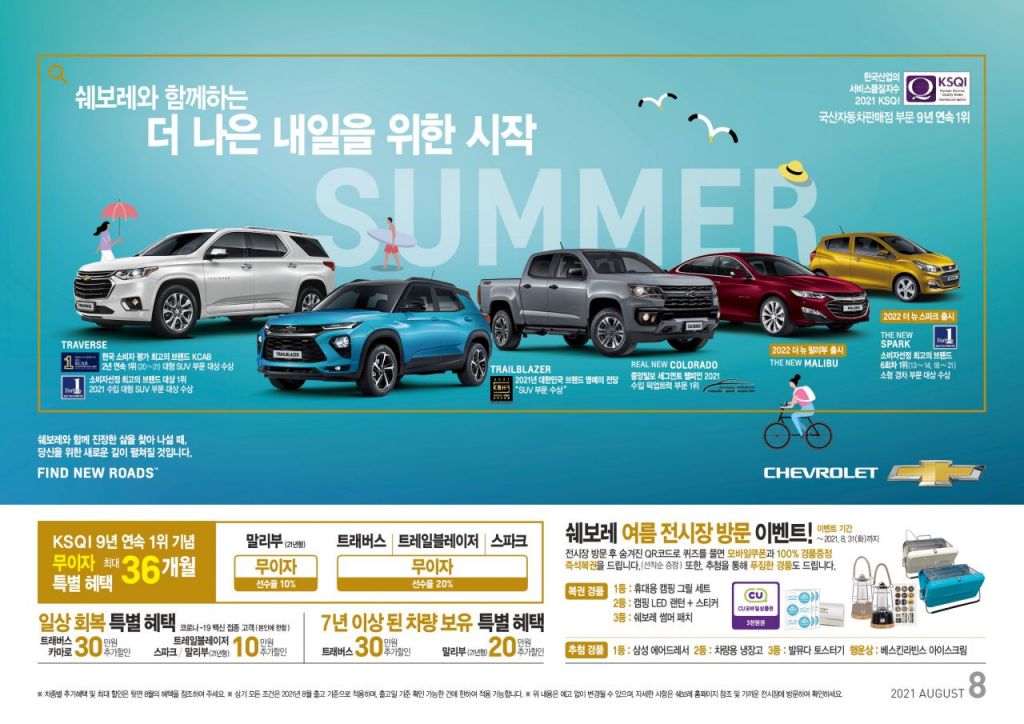 [아시아경제 유제훈 기자] 쉐보레는 8월 '쉐보레와 함께하는 더 나은 여름을 위한 시작' 프로모션을 시행한다고 1일 밝혔다.