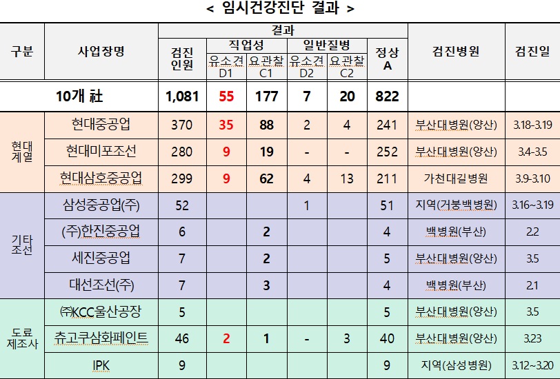고용부는 지난 2~4월 현대 계열 조선소 3개소와 도료 제조사 3개소, 기타 조선소 4대소 등 10개사 1080명에게 건강진단을 해보니 55명이 피부질환을 앓고 있었다고 밝혔다. 이 중 53명은 현대 계열 조선3사 근로자였다.