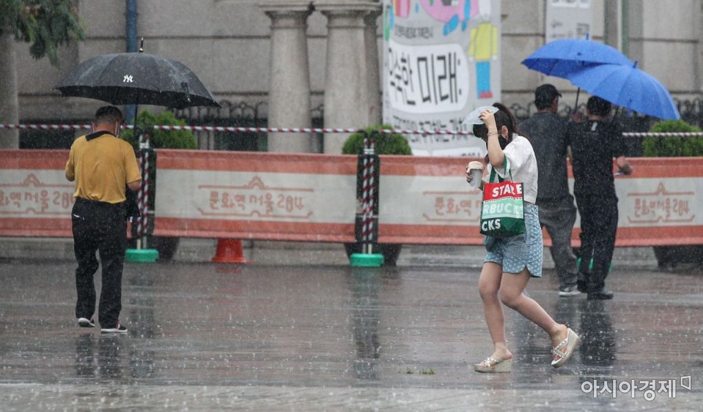 서울을 비롯한 중부지역에 산발적으로 소나기가 내리고 있는 1일 서울역 인근에서 시민들이 발걸음을 재촉하고 있다./강진형 기자aymsdream@
