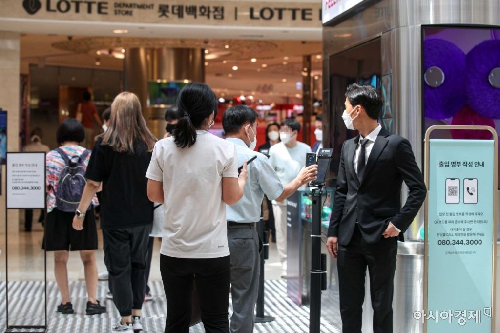 백화점, 대형마트의 QR코드와 안심콜 체크인 등 방문객 의무 확인이 시행된 30일 서울 중구 롯데백화점 본점을 찾은 고객들이 방문객 확인 절차를 밟고 있다./강진형 기자aymsdream@