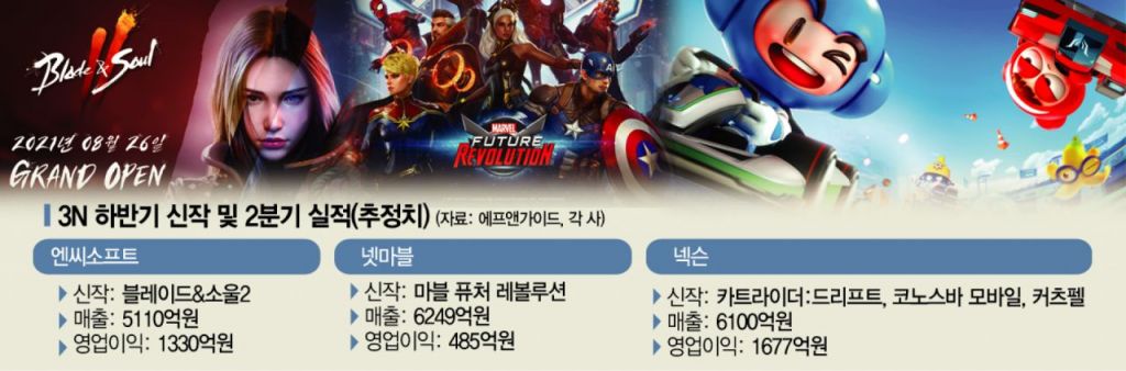 2분기의 경우 신작 출시 지연 등의 여파로 이들 게임업체의 실적이 악화된 것으로 관측된다. 금융정보업체 에프앤가이드에 따르면 3N의 2분기 실적은 시장 전망치보다 하회할 것으로 예상됐다. 엔씨의 2분기 매출과 영업이익은 5110억원, 1330억원으로 추정됐다. 이는 전년보다 5%, 36% 줄어든 수치다. 블소2 출시 일정이 상반기에서 하반기로 연기된 데다가 리니지M·2M이 ‘오딘’에게 매출 순위가 역전된 탓이다. 다만 블소2 사전예약자가 746만명에 이르는 만큼 엔씨가 반격에 나설 것이라는 예측이 높다. 김창권 미래에셋증권 연구원은 "블소2의 3분기 일평균 매출은 50억원에 달할 것"이라고 전했다.