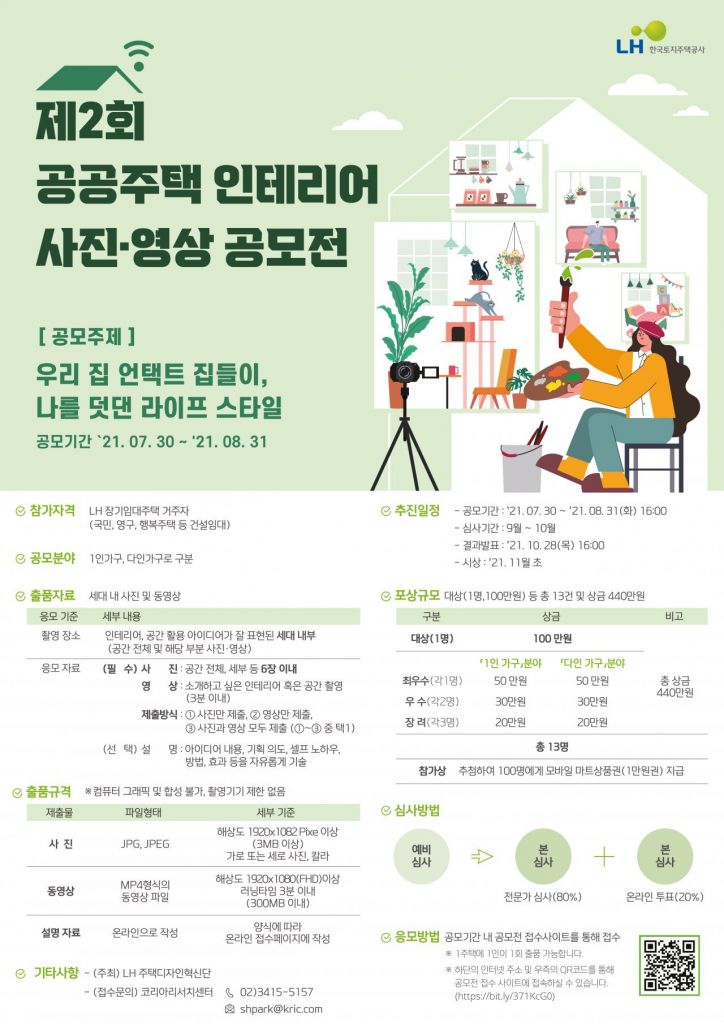 이번 공모전은 ‘우리 집 언택트 집들이 - 나를 덧댄 라이프 스타일’을 주제로 한다. LH가 건설한 장기임대주택(영구임대, 국민임대, 행복주택, 50년 공공임대)에 거주하는 입주민이라면, 계약자 여부 상관없이 누구나 참여 가능하다. 각 세대 당 1인만 참가할 수 있다.