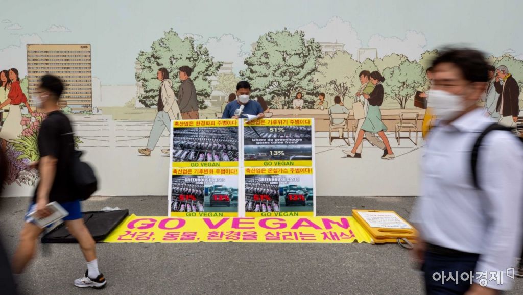 4일 서울 종로구 세종로 네거리에서 한국채식연합회 소속 관계자가 기후 위기의 열쇠 '비건(vegan) 채식'을 촉구하는 1인 시위를 펼치고 있다./강진형 기자aymsdream@