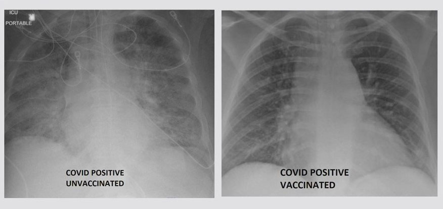 반면 백신을 맞지 않은 환자의 폐 사진에는 하얀 부분이 많았다. 이를 폐음영(lung opacity)이라고 한다. 공기가 희박하다는 뜻이다. 폐포가 공기로 가득 차 있어야 하는데 공기 대신 유체(流體), 박테리아, 면역계 세포로 가득 차 있는 것을 말한다. 따라서 환자는 산소를 정상적으로 공급받을 수 없다.