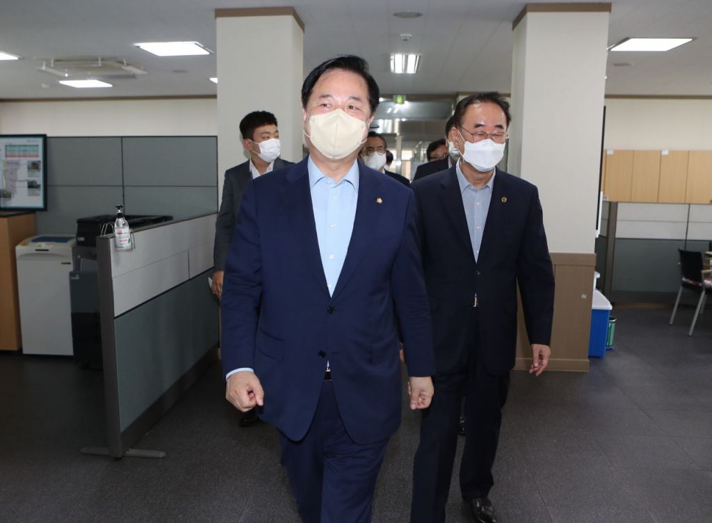 더불어민주당 김두관(가운데) 대선 예비후보가 경북 구미시를 방문해 장세용(오른쪽) 시장과 면담을 가졌다. [이미지출처=연합뉴스]
