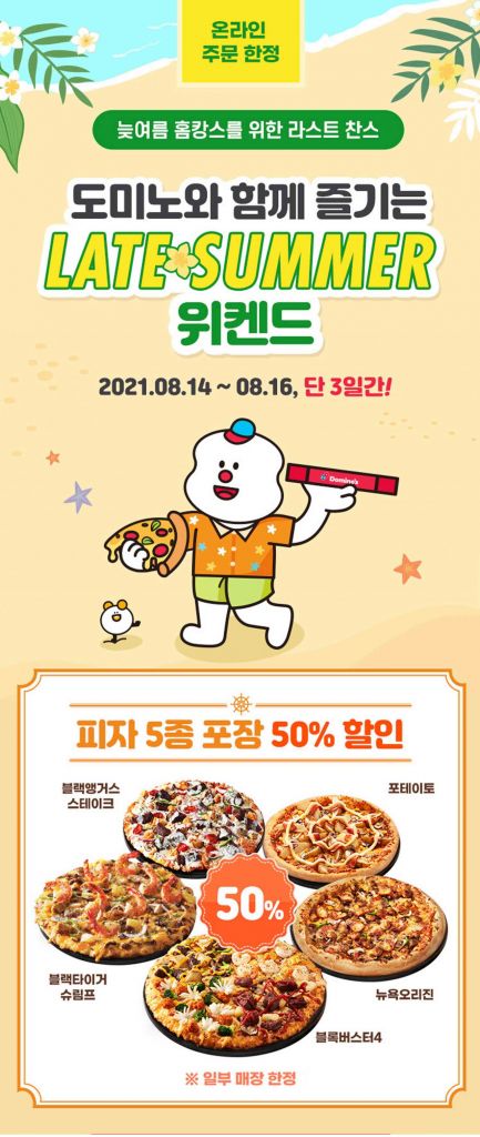 [아시아경제 문혜원 기자] 도미노피자는 광복절을 포함한 3일간의 연휴를 맞이해 무더위를 피해 늦여름 홈캉스를 즐길 수 있도록 온라인 방문 포장 주문 시 베스트 피자 5종을 50% 할인하는 ‘레이트 썸머 위켄드’를 진행한다고 13일 밝혔다.