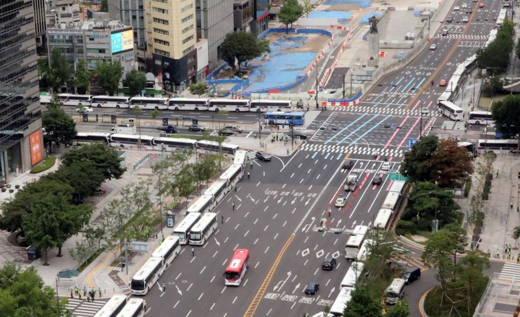 경찰이 광화문 인근 도로에 차벽을 세워놓고 있다. 전광훈 사랑제일교회 담임목사가 이끄는 국민혁명당은 광복절 연휴 사흘간 오전 6시부터 오후 6시까지 동화면세점·서울시청·서울역 등 도심 일대에서 '문재인 탄핵 8·15 1천만 1인 걷기 운동'을 진행한다고 밝혔다. 경찰은 이를 1인 시위를 빙자한 불법집회라고 보고 차단할 방침이다. 사진 = 연합뉴스