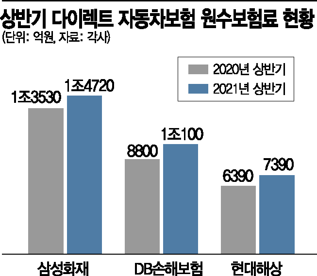 17일 보험업계에 따르면 다이렉트 자동차보험 시장에서 삼성화재와 DB손해보험, 현대해상 등 3사의 점유율은 올 상반기 기준 69.8%로 전년말 보다 0.5%포인트 늘어났다. ‘빅3’의 점유율은 2017년 60%를 넘어선 이후 4년 만에 10%포인트 가량 뛰었다.